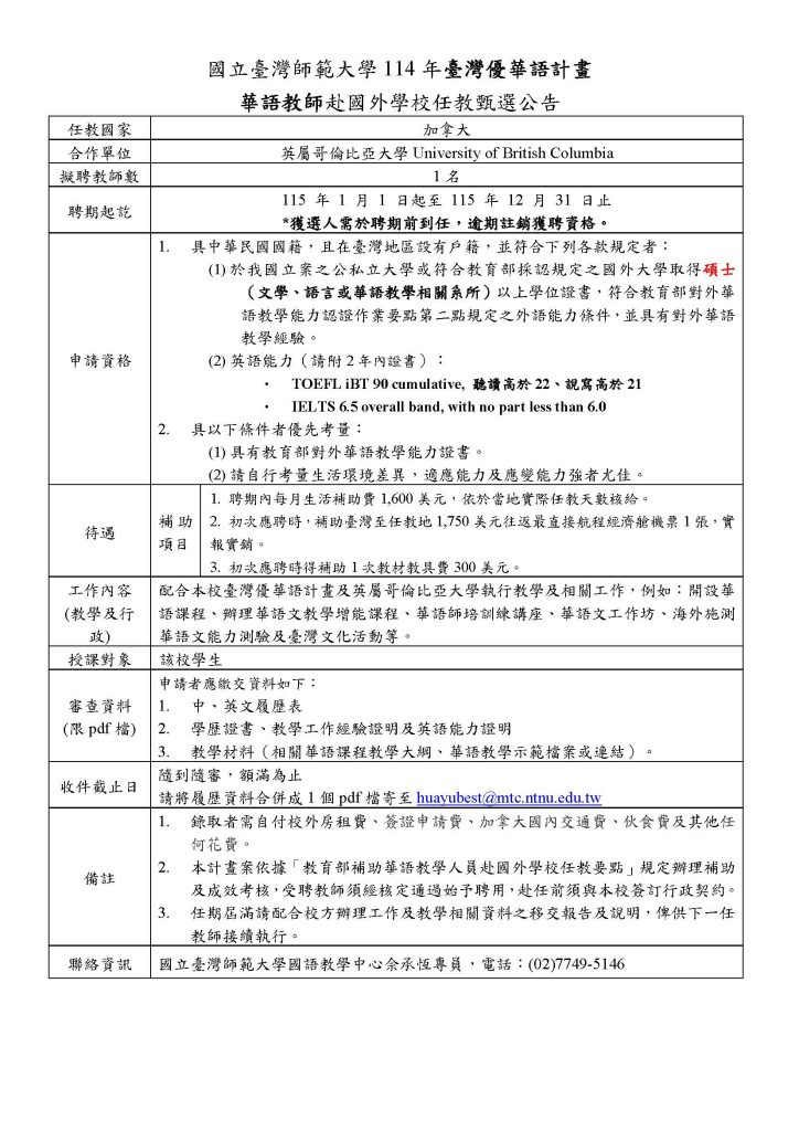 【公告】114年臺灣優華語計畫華語教師赴國外學校任教甄選公告–加拿大英屬哥倫比亞大學