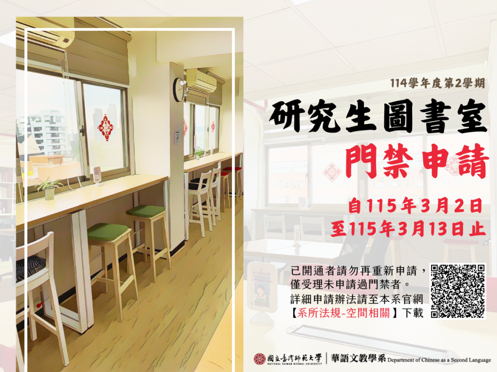 【公告】114-2綜905研究生圖書室門禁申請自115年3月2日9:00至115年3月13日17:00止 【綜905研究生圖書室門禁申請注意事項】圖書室門禁僅限本系碩、博研究生申請。114-2學期申請期間自115年3月2日(一)9:00至115年3月13日(五)17:00止。請於上班時間(9:00-17:00)攜帶學生證及填妥申請表後至系辦找芙萍助教辦理,午休時間(12:00-13:30)恕不受理。每學期初皆會開放申請,若此次未及申請,可於下學期初再行申請。已開通者請勿再重新申請,僅受理未申請過門禁者。申請辦法及表單連結 為確保圖書室使用順利,凡申請者,助教將進行簡單口頭測驗,請務必先詳閱圖書室申請規則喔 ! Post author:tcsl Post published:2026 年 2 月 23 日