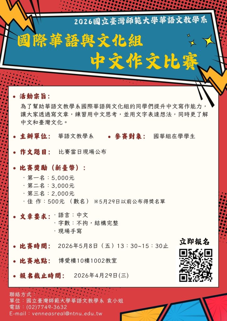 【活動】臺師大華語文教學系國華組中文作文比賽,即日起開始報名至115年4月29日(三)截止