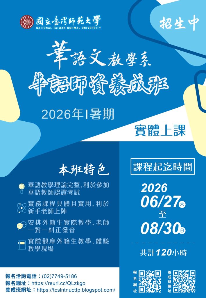 「2026年暑期華語師資養成班」即日起至115年5月26日開放報名,額滿為止!